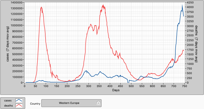 In Western Europe, cases seem to have peaked but deaths are still trending up. In the EU 72,1% of the population are fully vaccinated and 75,2% have had at least 1 dose. 45,7% of the population has had a booster shot. The EU and Western Europe are not the same but there is a large overlap between them so I think it is useful to quote EU vaccinations to provide context for this graph.