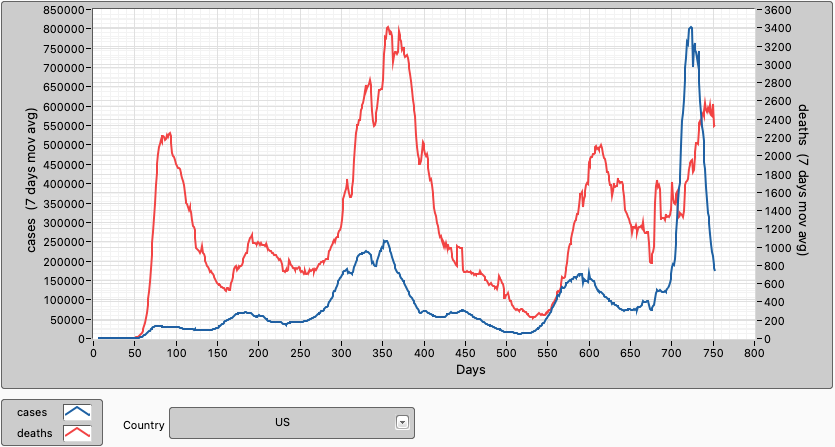 In the US cases are trending down now while deaths are flat. 63,8% of the population are fully vaccinated and 75,2% have had at least 1 dose. 27,3% of the population has had a booster shot.