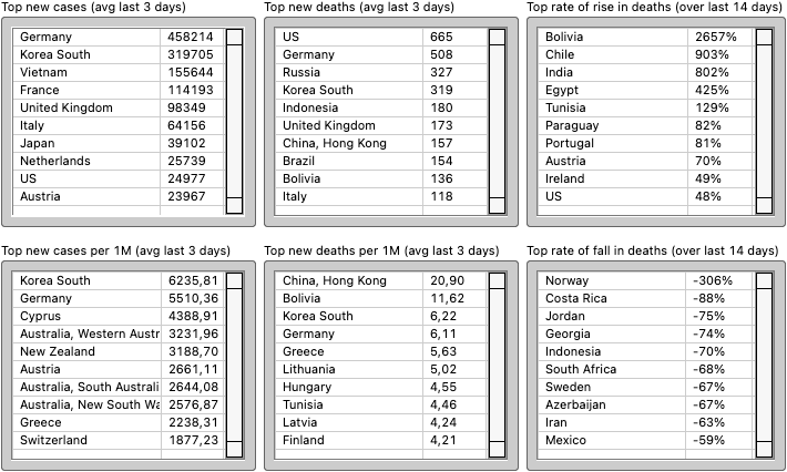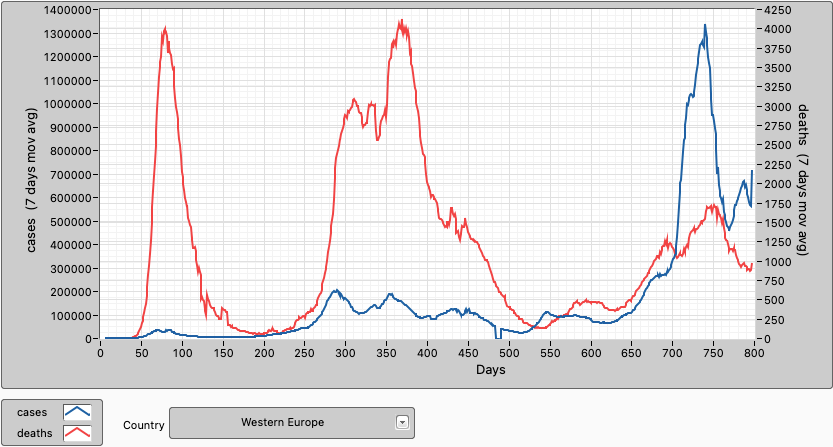 In Western Europe, cases and deaths are trending down. In the EU 73,5% of the population are fully vaccinated and 75,9% have had at least 1 dose. 49,8% of the population has had a booster shot. The EU and Western Europe are not the same but there is a large overlap between them so I think it is useful to quote EU vaccinations to provide context for this graph.