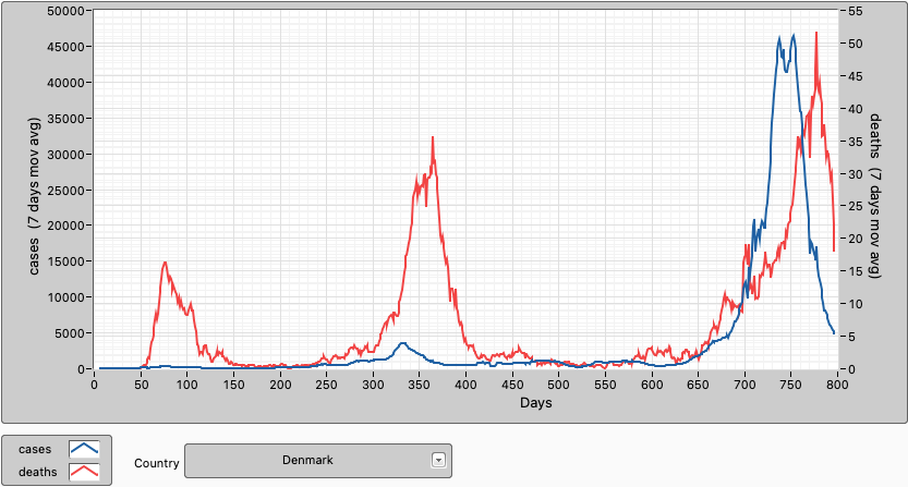 In Denmark, all Covid-19 restrictions have been lifted from February 2022 (day 740). 81,3% of the population are fully vaccinated, 83,1% have had at least 1 dose and 62,0% have had a booster shot.