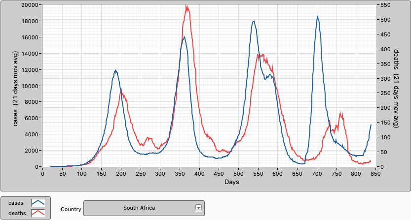 South Africa reported 26 deaths yesterday. Cases are rising quickly, and deaths are slowly starting to rise as well. 30,9% of the population are fully vaccinated and 35,9% have had at least 1 dose. 4,8% of the population has had a booster shot.