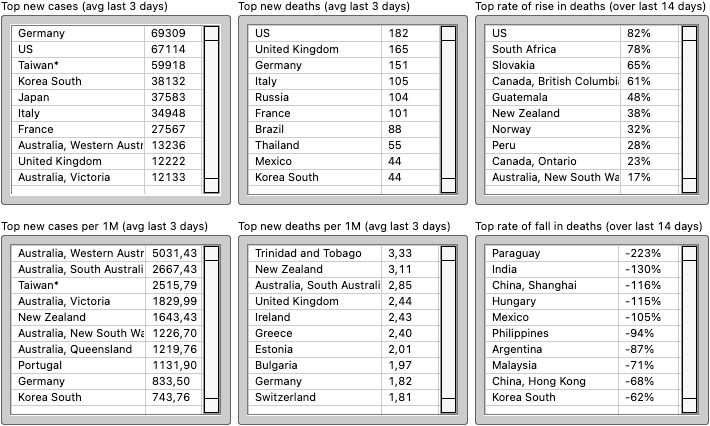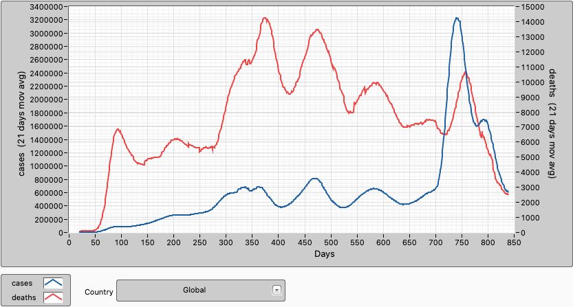In Western Europe, cases and deaths are trending down. In the EU 74,1% of the population are fully vaccinated and 76,2% have had at least 1 dose. 52,0% of the population has had a booster shot. The EU and Western Europe are not the same but there is a large overlap between them so I think it is useful to quote EU vaccinations to provide context for this graph.