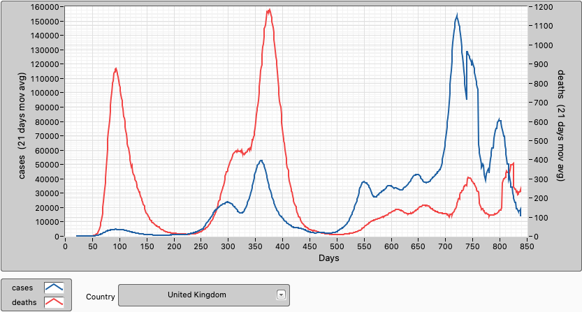 In the UK cases and deaths are trending down. 74,1% of the population are fully vaccinated and 79,3% have had at least 1 dose. 58,5% of the population has had a booster shot.