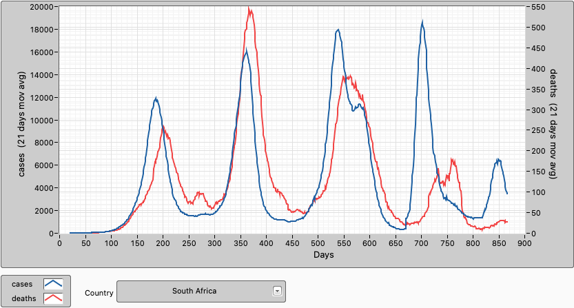 South Africa reported 80 deaths yesterday. Cases and deaths seem to have peaked now and are trending down now. 31,6% of the population are fully vaccinated and 38,2% have had at least 1 dose. 5,4% of the population has had a booster shot.