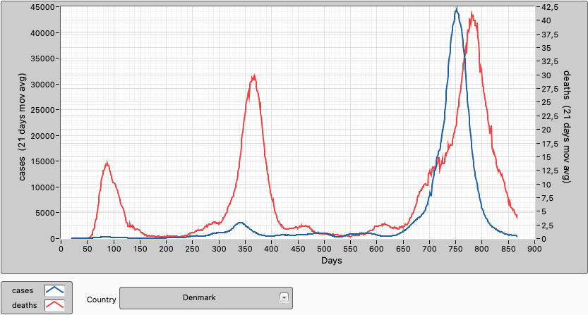 In Denmark, all Covid-19 restrictions have been lifted from February 2022 (day 740). 82,4% of the population are fully vaccinated, 83,0% have had at least 1 dose and 62,5% have had a booster shot.