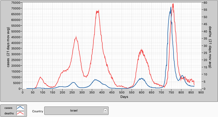 In Israel, cases and deaths are very low now. 66,6% of the population are fully vaccinated, 76,6% have had at least 1 dose and 57,6% have had a booster shot.