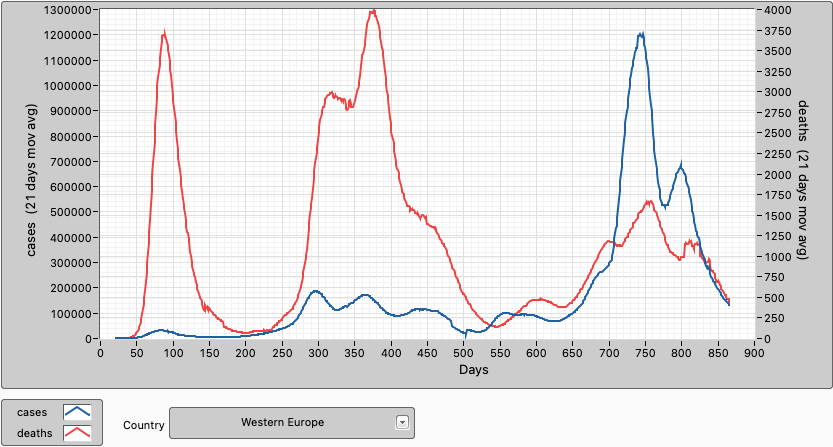 In Western Europe, cases and deaths are trending down. In the EU 73,9% of the population are fully vaccinated and 76,1% have had at least 1 dose. 52,9% of the population has had a booster shot. The EU and Western Europe are not the same but there is a large overlap between them so I think it is useful to quote EU vaccinations to provide context for this graph.