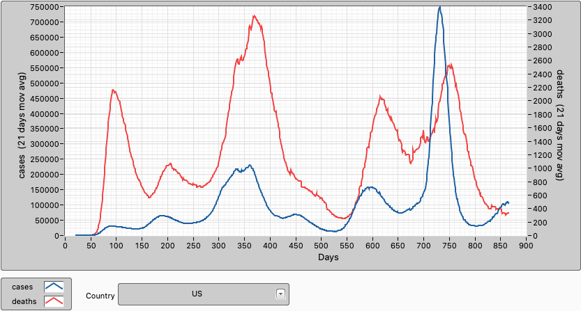 In the US deaths are still trending down while cases seem to have peaked now. 66,0% of the population are fully vaccinated and 77,2% have had at least 1 dose. 30,8% of the population has had a booster shot.